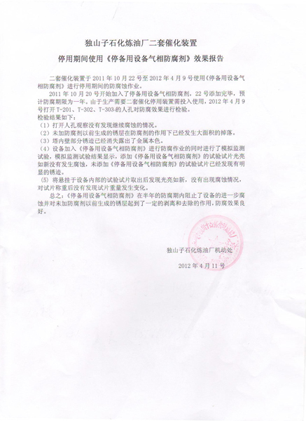停備用設(shè)備氣相防腐劑在延長(zhǎng)石油集