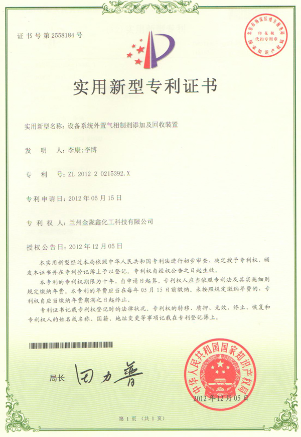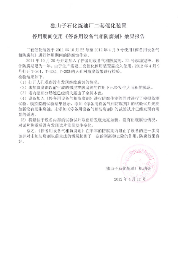 實(shí)用新型專利證書 《停備用設(shè)備氣相防腐劑》用戶使用效果報告