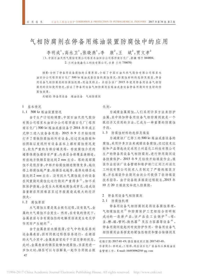 《停備用設(shè)備氣相防腐劑在停備用煉油裝置防腐蝕中的應(yīng)用》文章正式出版