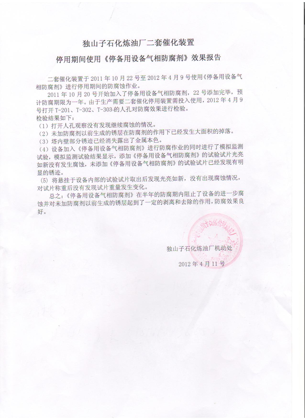 停備用設(shè)備氣相防腐劑獨山子石化使用效果報告正式文件